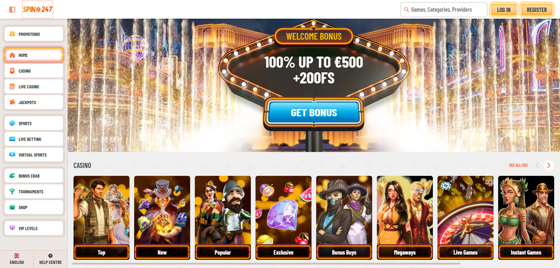- Bônus de Boas-Vindas Generoso: 100% de bônus até €500 + 200 rodadas grátis + 1 Bonus Crab para novos jogadores.