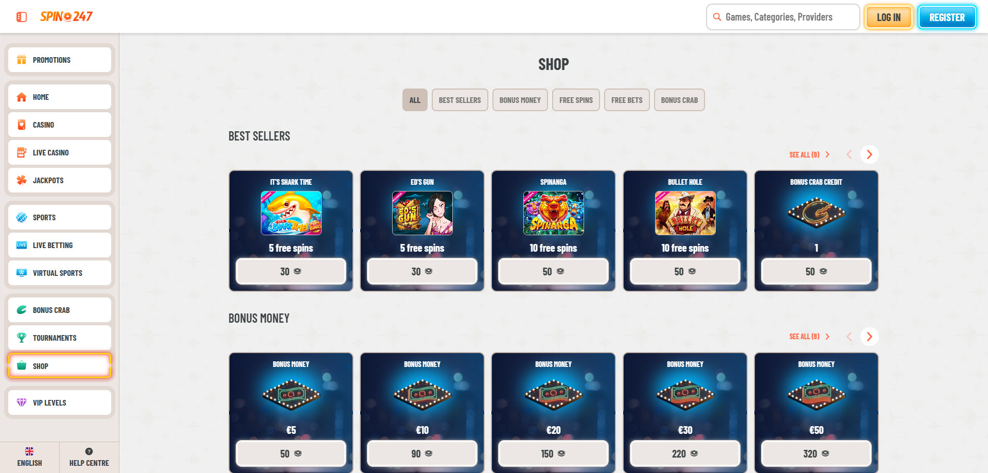 - Fiat: Detalhes dos métodos estão disponíveis em spin247.com/en/payments.
